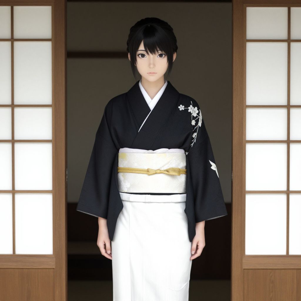 A stylish mannequin wearing a traditional Japanese kimono with a intricate, ornate headdress adorned with red and gold silk ribbons, jade beads, and delicate floral motifs. The kimono features rich brocade patterns of cherry blossoms and waves, flowing elegantly over the mannequin's form. The mannequin has a refined, serene expression, with a subtle sense of elegance and cultural grace. Additional accessories include a silver fan, a small red obi sash tied neatly at the waist, and a pair of ornate jade hairpins. The setting is a softly lit, modern Japanese-inspired interior with a minimalist backdrop, highlighting the craftsmanship and detail of the outfit.