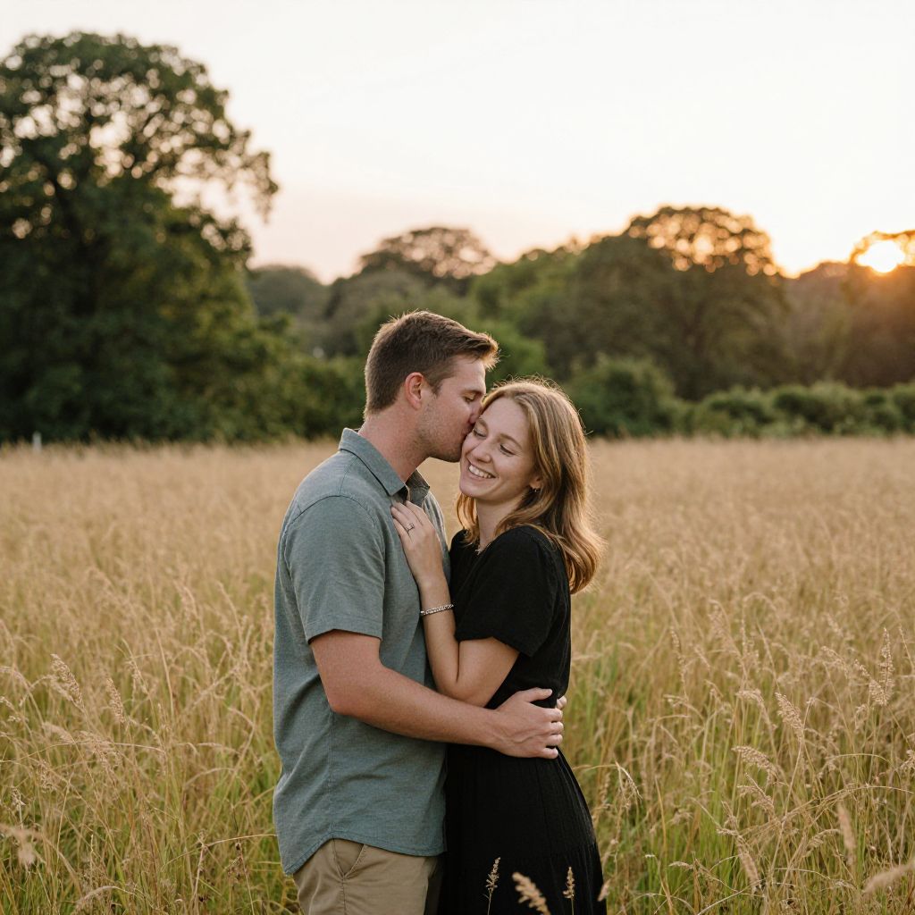Cotswold natural setting captures a tender moment as a couple embraces in a golden field, with the man gently nuzzling the woman's cheek while she beams with joy, surrounded by tall grasses and a backdrop of lush green trees under a soft sunset sky.