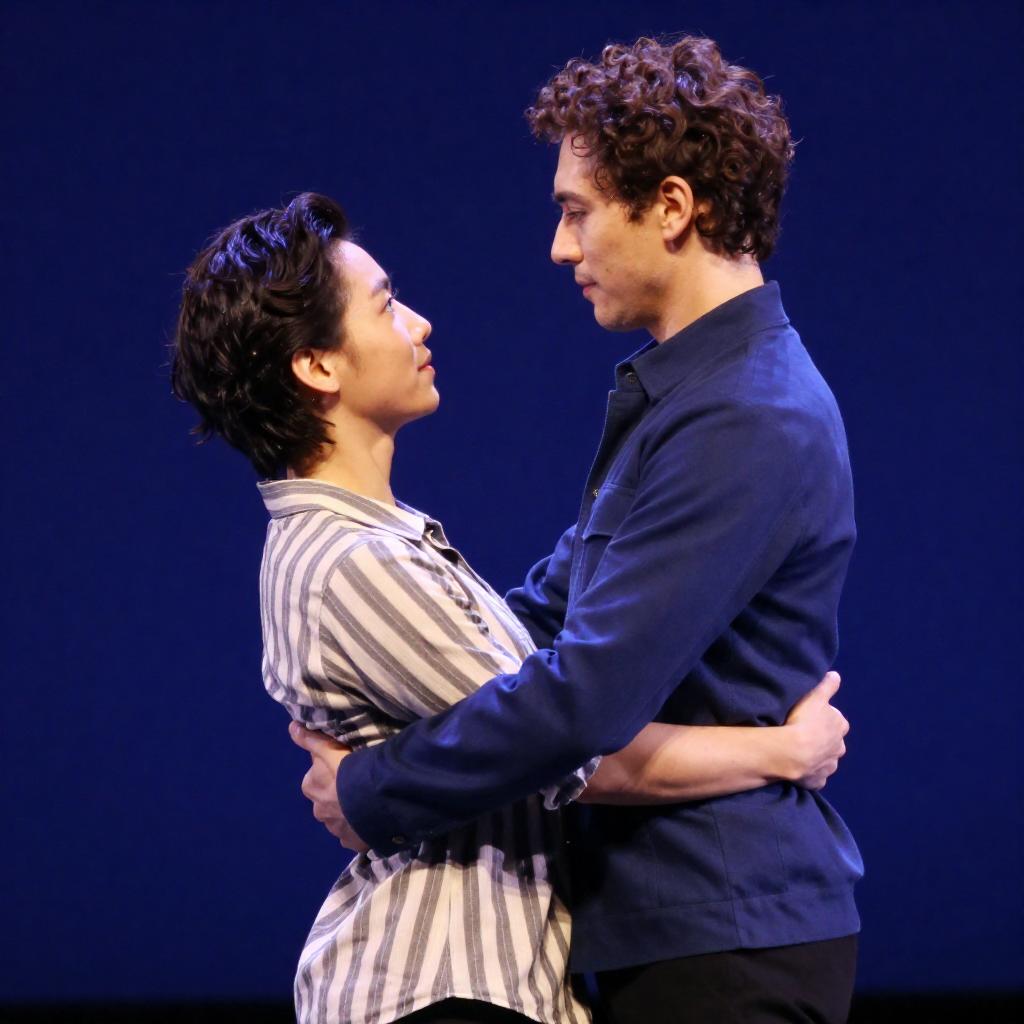 Photograph of two people standing center stage, facing each other. Woman on left wears white dress with puffed sleeves, red belt; man on right wears tan jacket, dark pants. Both in profile. Background: dark stage, four other people in silhouette, colorful stage lights. Woman's hair in bun, man's hair styled up.