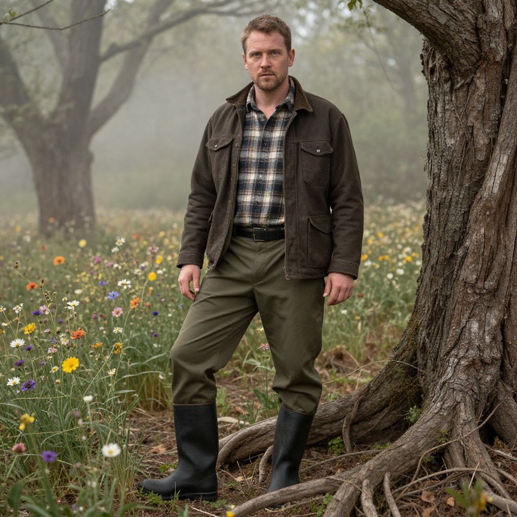A man, hunting pants in olive green, fitted flannel shirt in plaid, rugged canvas jacket in dark brown, black waterproof boots, gnarled roots intertwining, mist rising from the forest floor, vibrant wildflowers peeking through, hand-tinted photograph, contemplative expression Man has masculine face and piercing eyes