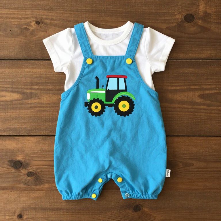 Photograph of blue baby overalls with green tractor graphic, yellow buttons, over a white short-sleeve shirt, on wooden floor.