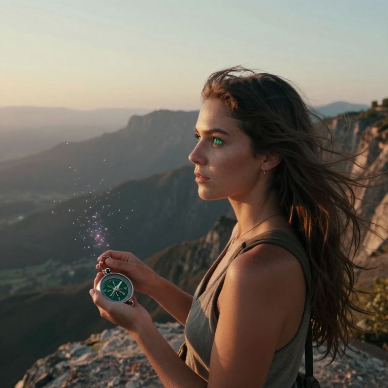 An enigmatic wanderer with emerald eyes and sun-kissed skin stands atop a cliff at dawn. Her wind-tousled hair frames her face as she gazes fixedly towards the horizon. In one hand, she holds a compass whose needle spins wildly amidst a storm of micro-flares that flicker like distant constellations. The bird's-eye perspective reveals a breathtaking panorama of rugged mountains and vast valleys bathed in ethereal morning light. A subtle shift in her expression hints at untold stories and adventures lurking within.