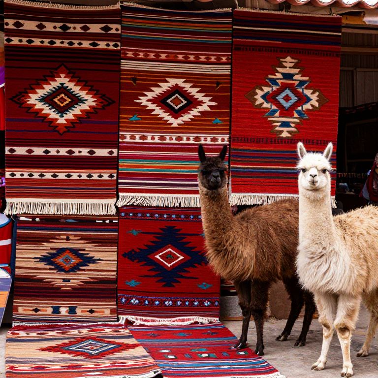 Vibrantly colored local carpets, crafted from llama and alpaca wool, are displayed for sale at the bustling market in Purmamarca, Quebrada de Humahuaca, Jujuy Province, Argentina, showcasing intricate geometric patterns and bold hues that reflect traditional Andean craftsmanship.