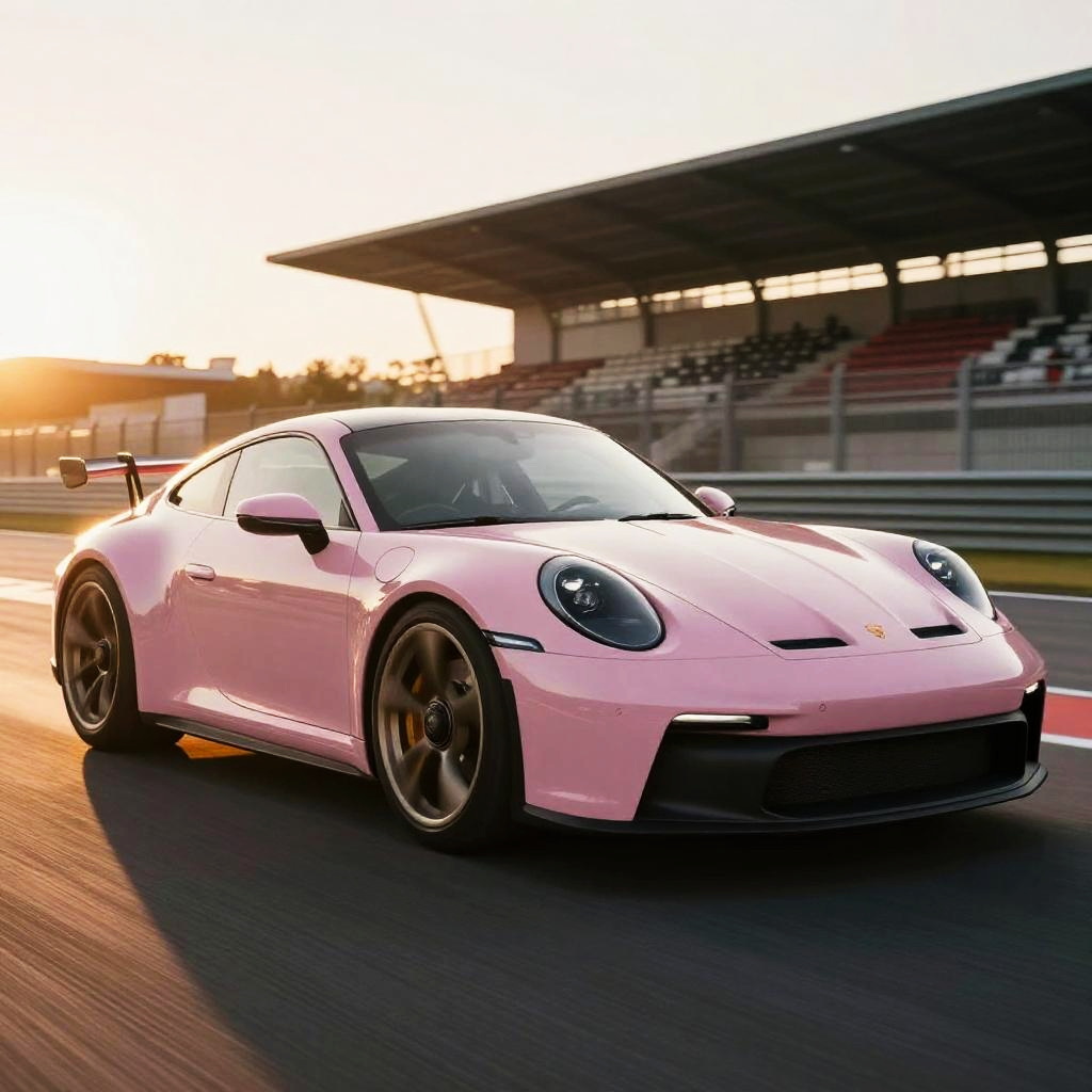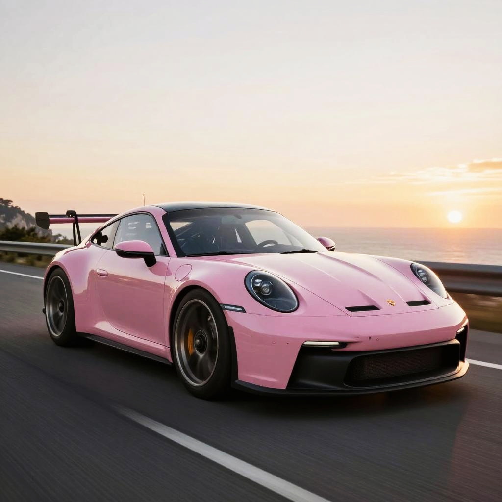 Porsche frog eyes design, close-up of iconic round headlights on a sleek silver Porsche sports car, urban night setting with glossy reflections, detailed automotive style, dynamic perspective, futuristic city lights background