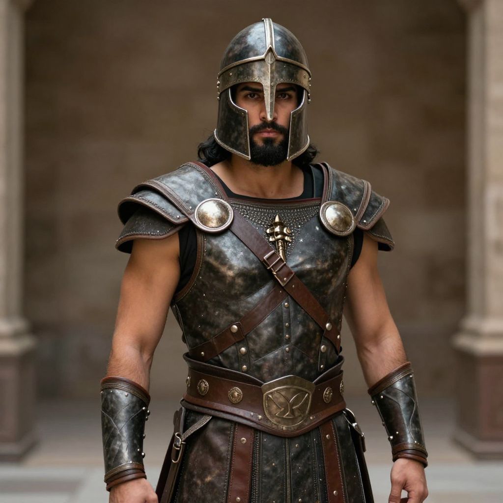 Photograph of a muscular, bearded man with a stern expression, dressed in ancient Roman-style armor. He wears a metallic helmet with a central ridge, dark, leather-embroidered armor with metallic shoulder plates and a brown leather belt with a circular, embossed buckle. A leather strap crosses his chest, and he has matching leather bracers on his forearms. The background is blurred, featuring stone columns, suggesting a historical or classical setting. The armor is dark and weathered, with a shiny, reflective texture. The overall composition is centered, with the man standing facing the camera.