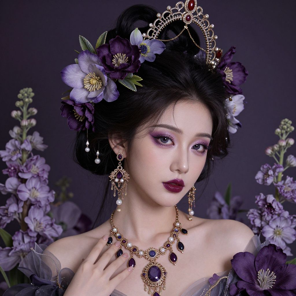Photograph of an East Asian woman with pale skin and dark hair styled in an elaborate updo adorned with purple flowers and a gold crown. She wears purple eyeshadow, dark lipstick, and intricate gold and pearl jewelry, including a necklace with a large purple gem and matching earrings. Her off-the-shoulder, sheer gown is decorated with purple flowers. The background is a dark purple, with tall purple flowers framing her on both sides. Her expression is serene, with a soft gaze directed slightly to the right. The image has a fantasy, ethereal quality.