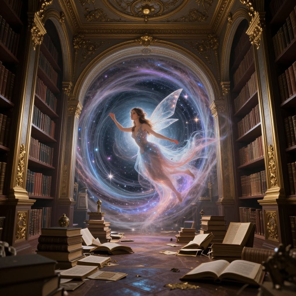 Digital art: Ethereal fairy with glowing wings in cosmic swirl, floating in ornate, book-filled library with scattered open books.