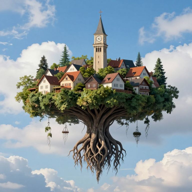 A serene village perched atop a colossal, inverted tree defies gravity, its roots sprawling skyward while lush foliage cradles quaint houses and a towering clock tower, all suspended in a dreamlike expanse of blue sky and fluffy clouds.