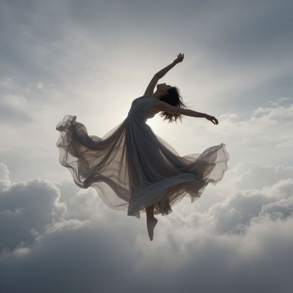 A woman in a flowing gown defies gravity, suspended gracefully against a backdrop of swirling clouds, her silhouette and dress merging with the ethereal mist in a dreamlike dance between earth and sky.
