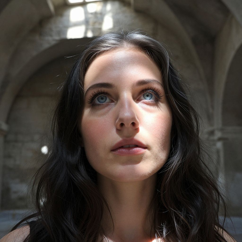 Photograph of a young woman with long black hair, blue eyes, and fair skin, looking upwards in an arched, dimly lit stone building