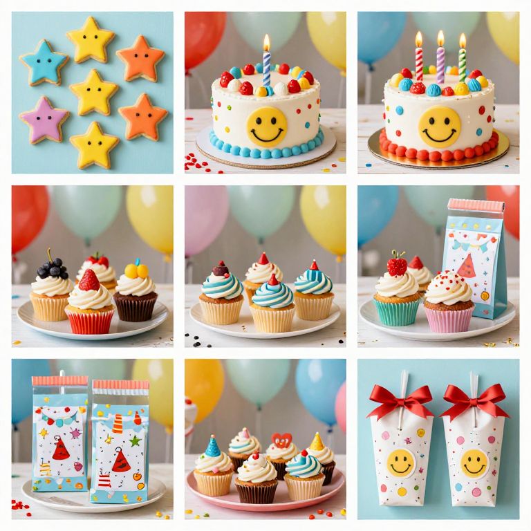 Colorful birthday collage: star decorations, candle cakes, cupcakes, cupcake tower, party bags, and gift boxes with balloons in background. Bright,