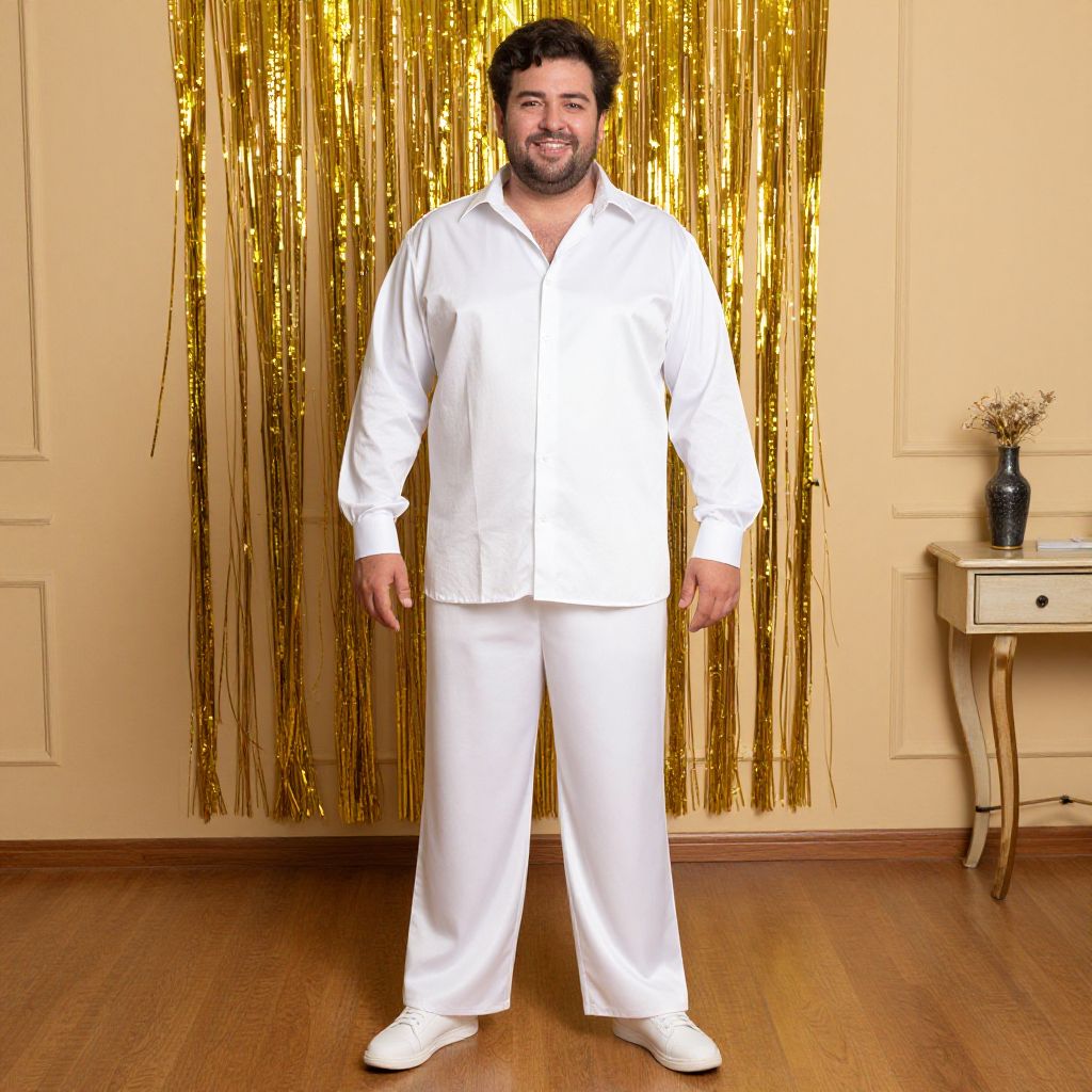 Plus Size Man Disco Costume, man in white shirt and white pants standing in a room