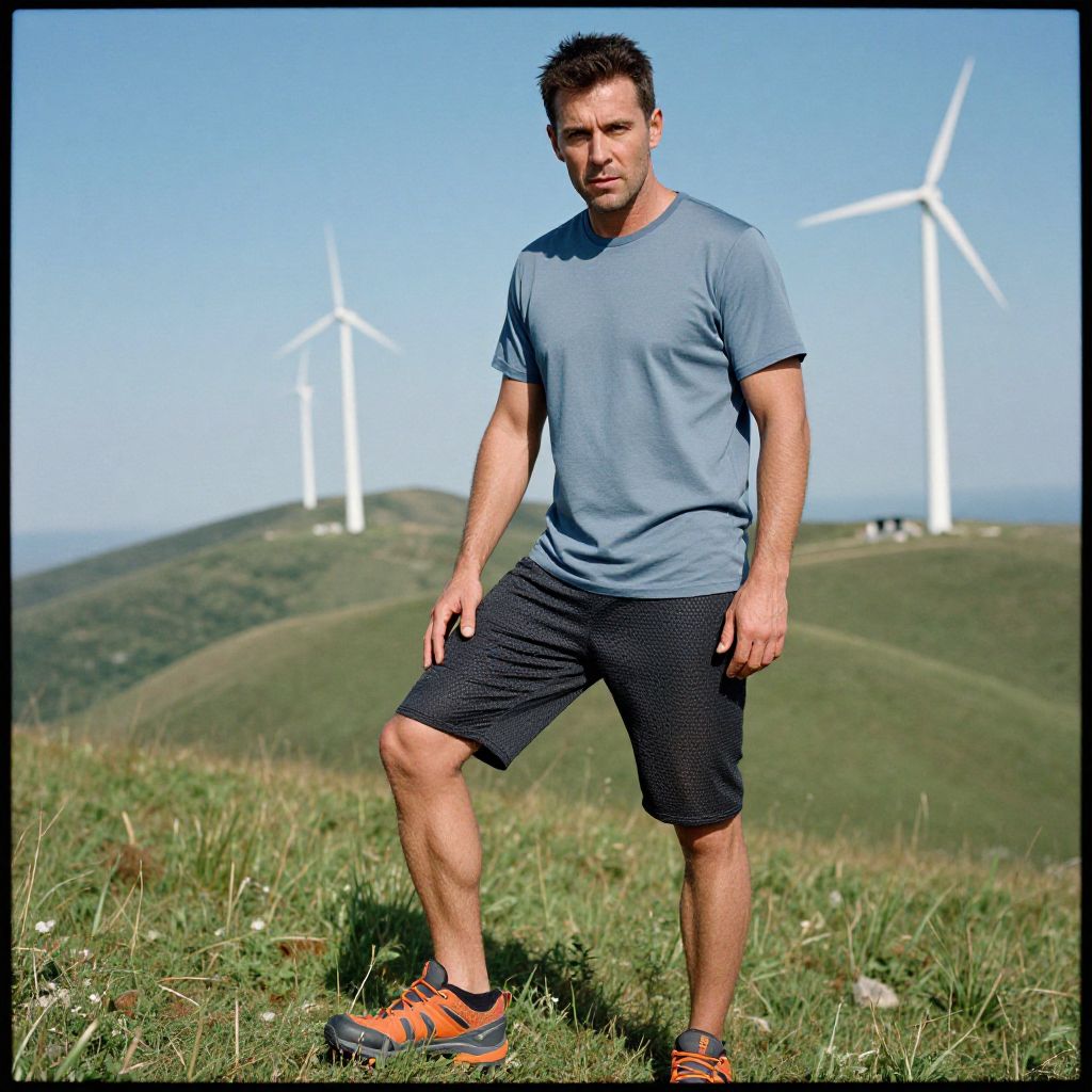 Photograph of a muscular man in a blue shirt and black shorts standing on a grassy hill, with two white wind turbines in the clear blue sky