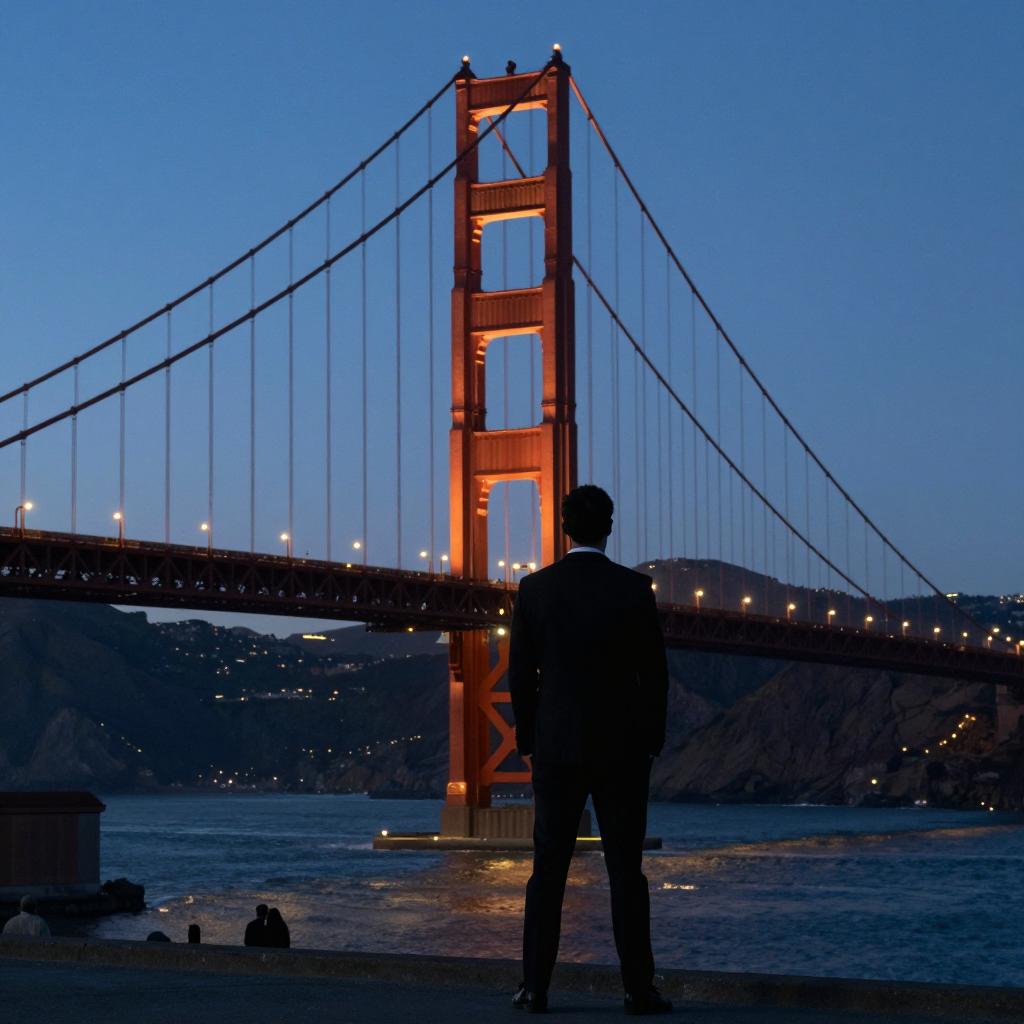Silhouette of a man in a suit standing on a bridge, facing a large, illuminated Golden Gate Bridge at night. Blue tint. Bridge cables and lights in the background. Water below. Two small figures near the bottom.
