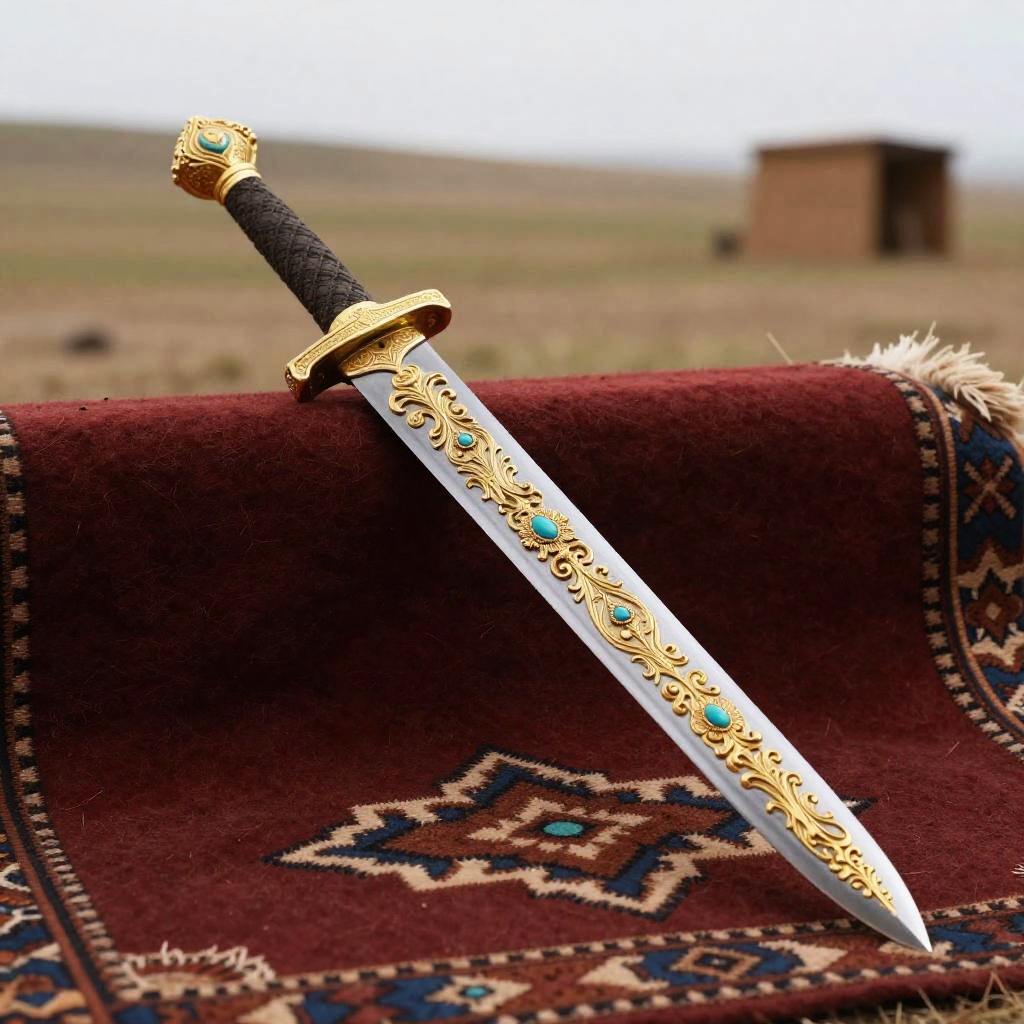 Kazakh sword displayed on traditional felt rug, intricate gold and turquoise engravings on blade, ambient natural light, ancient steppe background, ultra realistic style