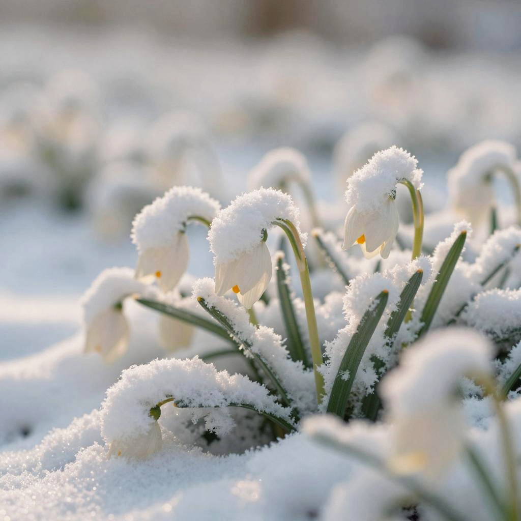 Photograph of a snowy garden scene featuring a close-up of white snowdrop flowers with delicate, drooping petals and small yellow stamens. The flowers are dusted with a layer of sparkling, white frost. The background is softly blurred, showing more snow-covered flowers. The image has a bright, sunlit quality, highlighting the contrast between the white snow and the subtle yellow of the stamens. The overall texture is soft and delicate, emphasizing the fragile beauty of the snow-covered flowers.
