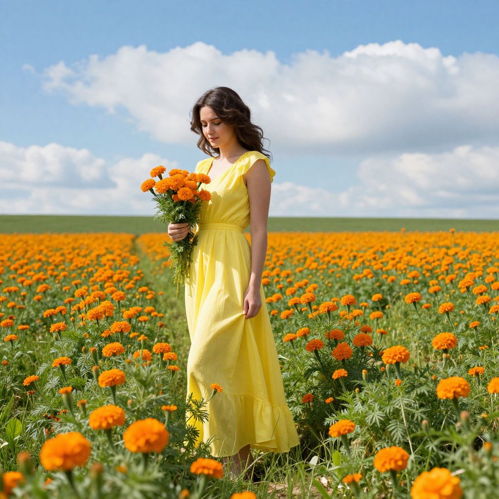 A woman in a flowing yellow dress stands amidst a vibrant field of orange marigolds, gently holding a bouquet as she gazes downward, surrounded by lush greenery and a backdrop of fluffy white clouds against a clear blue sky.