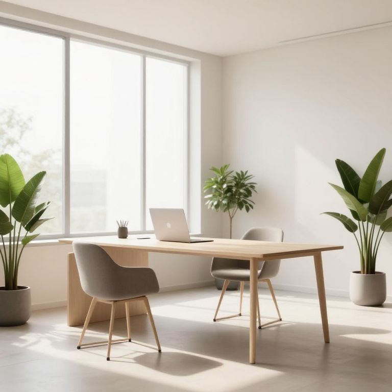 Photograph of a bright, minimalist office space with a large window on the left, flooding the room with natural light. A wooden table with light-colored legs stands in the center, surrounded by two gray, modern, mid-century style chairs with wooden legs. On the table is an open silver laptop and a small, potted succulent. Two large green potted plants are positioned in gray pots, one on each side of the window and one in the back right corner. The floor is smooth, light gray concrete, and the walls are white, enhancing the clean and modern aesthetic.