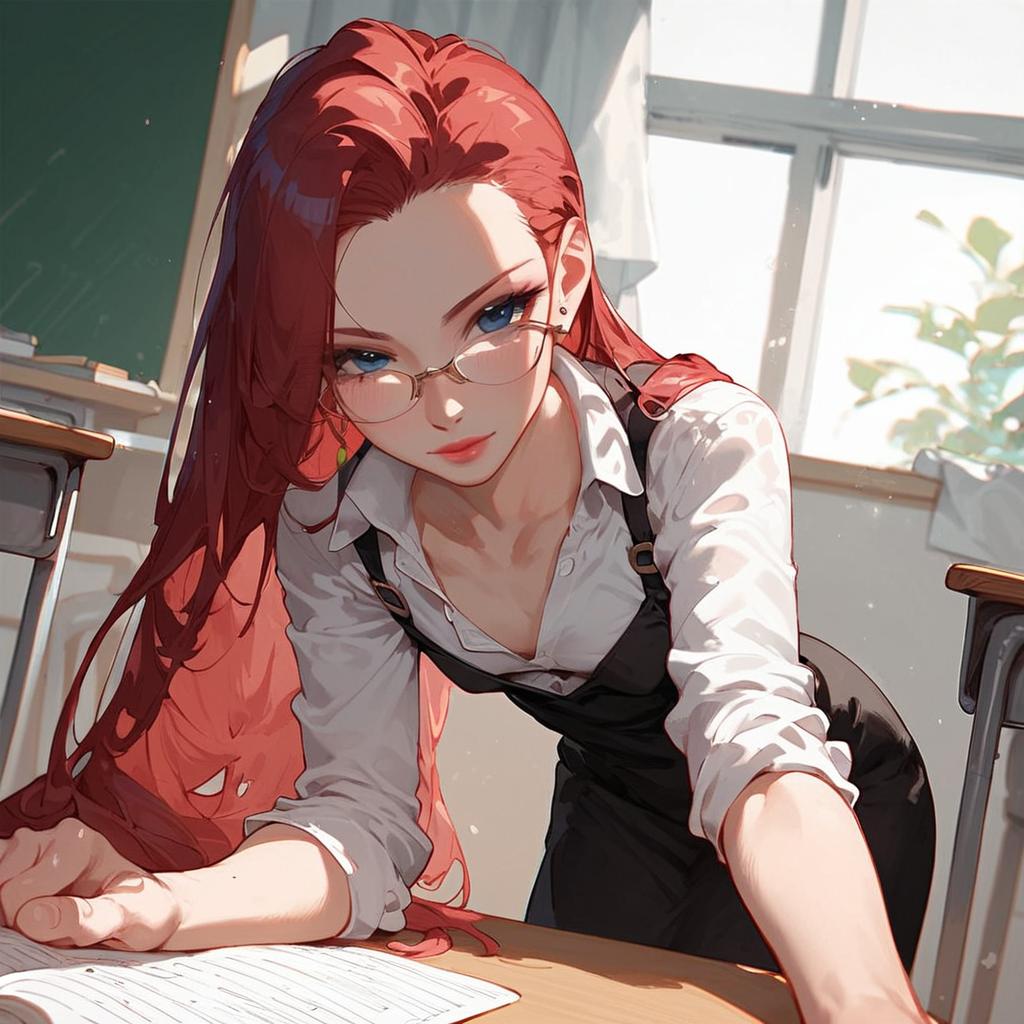 Score_9, score_8_up, score_7_up, score_6_up, source_anime, 1girl, solo, EPpkJessie, long hair, blue eyes, red hair, hair slicked back, teacher bent over towards viewer, collared shirt, white shirt, skirt, black dress, seductive smile, dutch angle, flat chest, partially unbuttoned, collarbone, school classroom, glasses, dimly lit, moody lighting