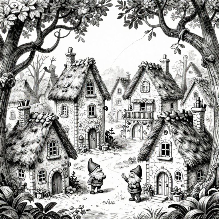 Whimsical black and white drawing of a gnome village, tiny houses with thatched roofs and stone chimneys, intricate architectural details, twisting tree branches overhead, vintage storybook illustration style, lively composition full of fantasy elements