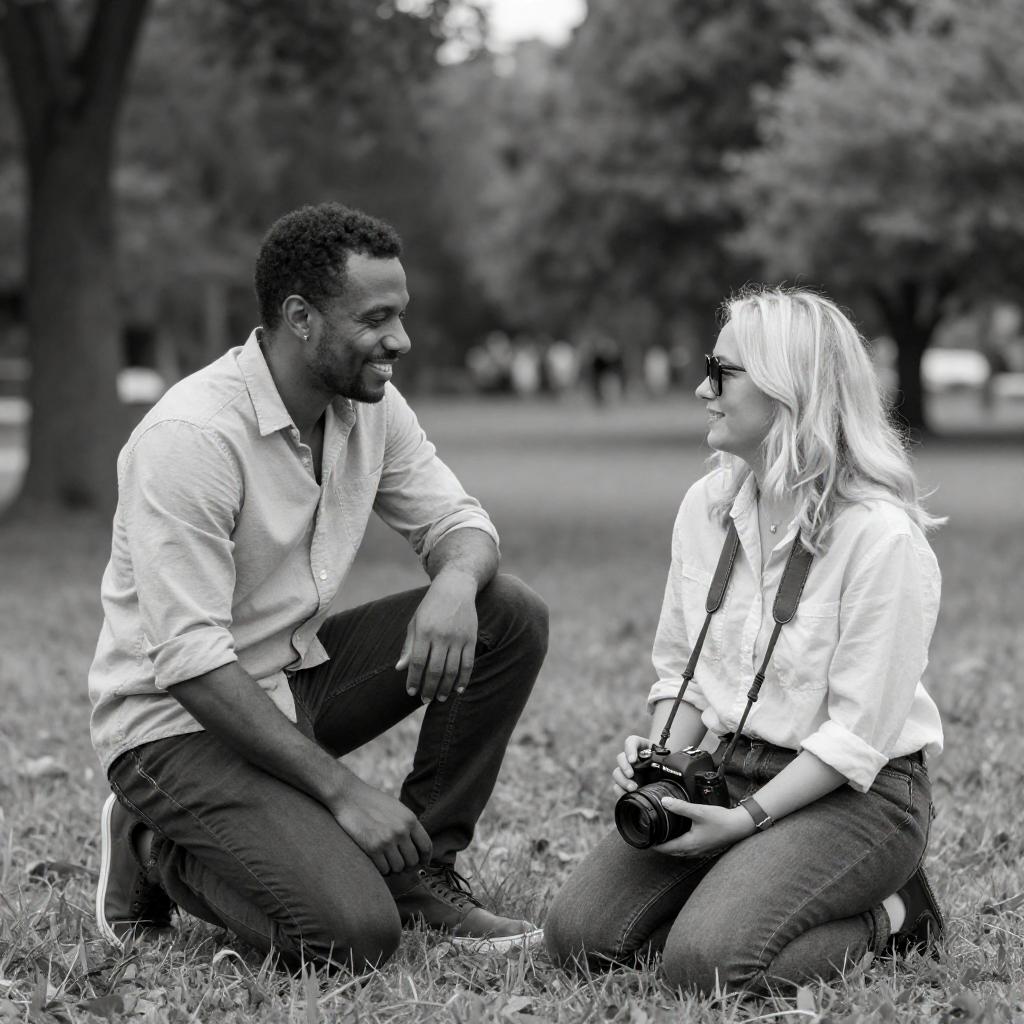 Black-and-white photograph of two people outdoors near a large tree. A Black man in a light sweater and dark pants crouches, adjusting the tree trunk. A white woman with long hair in a checkered blouse and apron sits beside an open wooden box containing food. Both focus on the box. Grass and trees in the background. The man's expression is concentrated, the woman's is slightly intense.