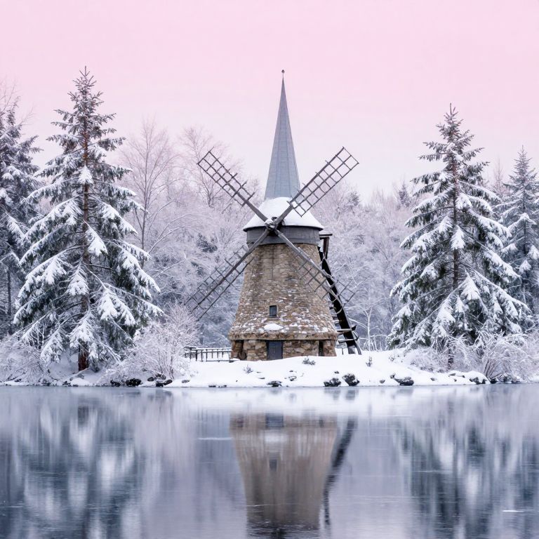 In a magical winter atmosphere, a water mill stands majestically on a frozen lake, surrounded by delicate, snow-laden fir trees. The scene is bathed in pastel colors and soft tones, creating a dreamlike ambiance. The mill, with its stone structure and pointed spire, is positioned centrally, flanked by trees on either side. The lake's surface is a tranquil mirror, reflecting the snowy landscape and the mill's silhouette. The overall composition is harmonious, with elements arranged in a balanced, symmetrical manner, evoking a sense of tranquility and wonder. The interplay of colors, textures, and shapes enhances the enchanting quality of the scene, making it a captivating visual experience.