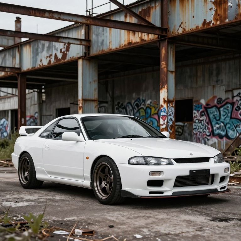 White JDM car in an abandoned industrial area, rusty metal structures and graffiti walls in the background, contrast between pristine car and gritty environment, dynamic composition with angled perspective, emphasizing car's aggressive stance and detailed craftsmanship