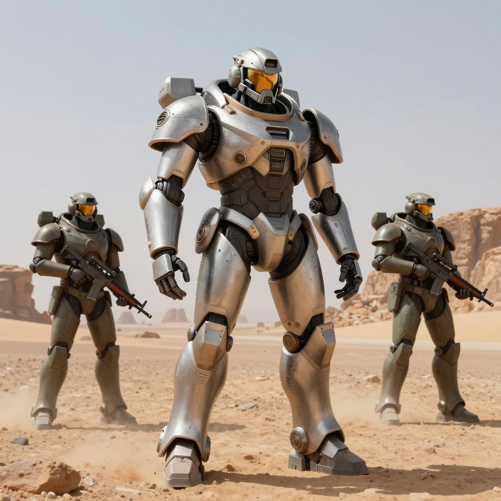 A group of futuristic armored mech warriors stand in a vast desert landscape. The central figure is a large, heavily armored mech with intricate details and weaponry. Smaller mech units and soldiers equipped with advanced armor and rifles accompany the main mech, set against a backdrop of arid terrain and scattered rock formations under a clear sky.