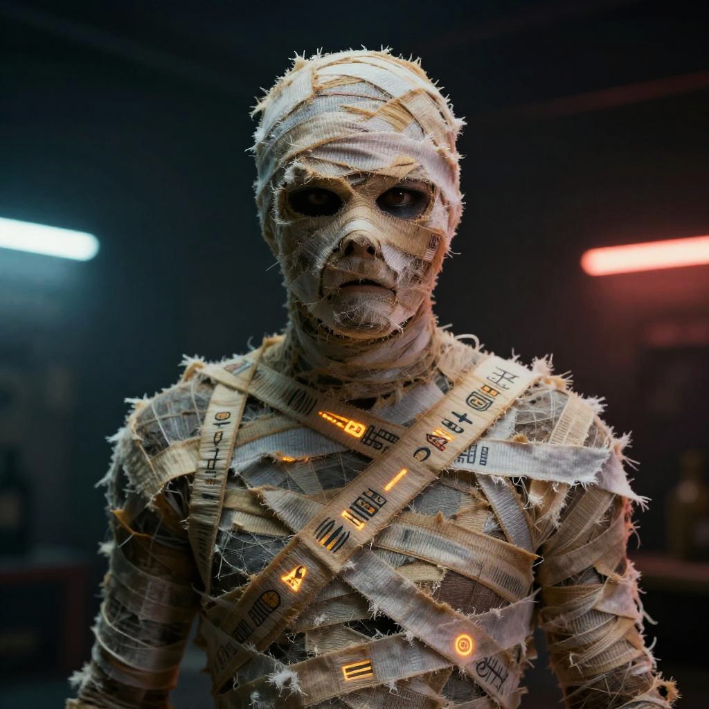 Realistic photo.a menacing mummy, with tattered bandages and glowing hieroglyphics, photorealistic, Kodak Portra 400, analog photography mood, depth of field, neon lighting, octane render, cinematic lighting, dramatic composition realistic photo