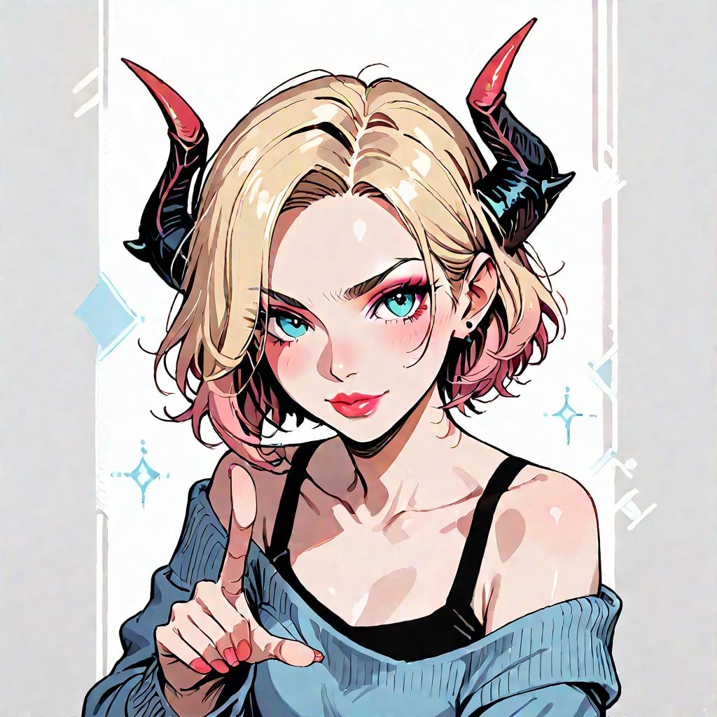 (score_9, score_8_up, score_7_up), source_anime, 1girl, demon_horns, solo, upper_body, fang, blonde_hair, multicolored_hair, short_hair, roots_\(hair\), highres, :3, black_shirt, blue_eyes, blue_sweater, commentary, covered_collarbone, grey_background, long_sleeves, looking_at_viewer, memcho, nail_polish, off_shoulder, one_eye_closed, open_mouth, pink_nails, pointing_at_self, simple_background, sleeveless_shirt