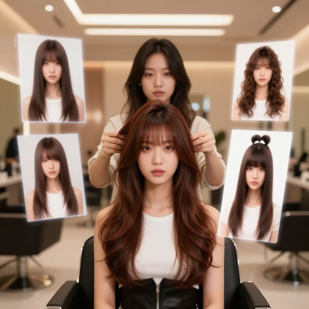 Online hairstyle changer for female, a futuristic virtual salon setting with a female avatar trying different trendy hairstyles, holographic hairstyle previews floating around, modern digital graphics, warm tones, creative hairstyle variations, high detail.