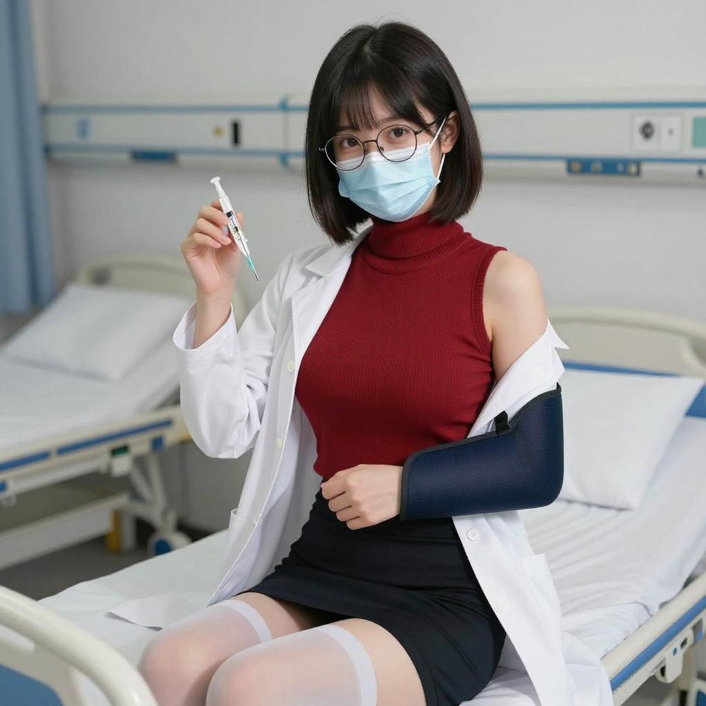 Masterpiece, best quality, hyper quality, 8k, absurdres, insane details, intricate details, hyperdetailed, high detail, ultra detailed, (realistic:1.4), 1girl, mouth mask, breasts, thighhighs, sitting, solo, crossed legs, skirt, sleeveless, large breasts, looking at viewer, short hair, indoors, bangs, bare shoulders, holding, off shoulder, doctor, brown eyes, black hair, blurry, pencil skirt, parted bangs, blurry background, thermometer, (holding syringe), ((labcoat, white coat, thighs, coat, open clothes, black skirt, red sweater, sleeveless sweater, red turtleneck:1.4, surgical mask:1.2, glasses:1.5)), miniskirt, arm support, open coat, zettai ryouiki, (sit on bed, hospital bed, hospital, white pantyhose, pureerosface_v1