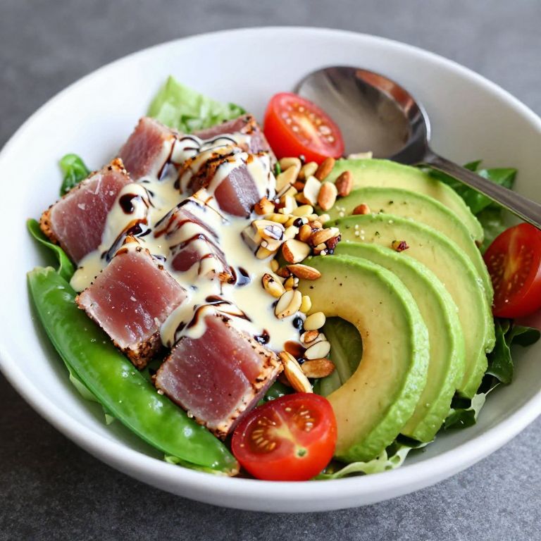 Winter salad featuring cubes of seared ahi tuna, creamy balsamic dressing, fresh avocado slices, cherry tomatoes, snap peas, and toasted almonds, served in a white bowl with a spoon resting on the side.