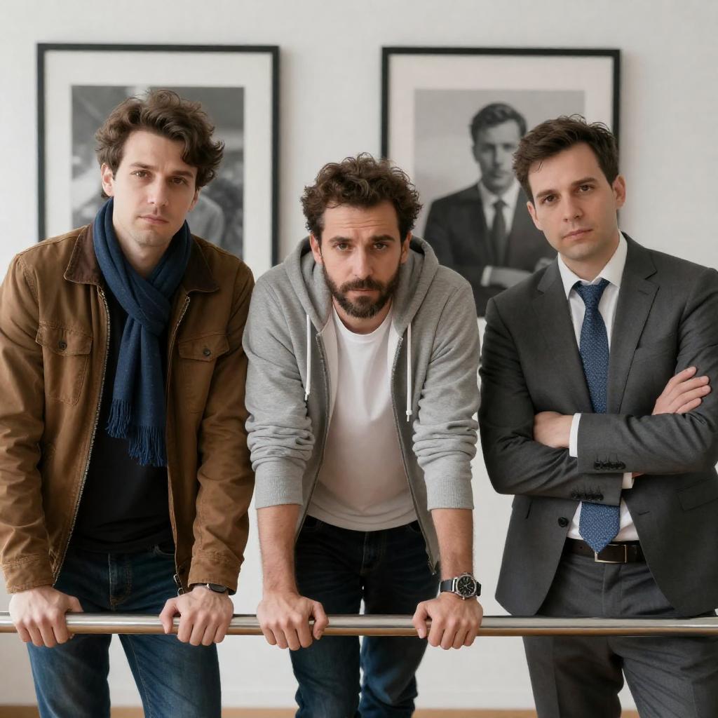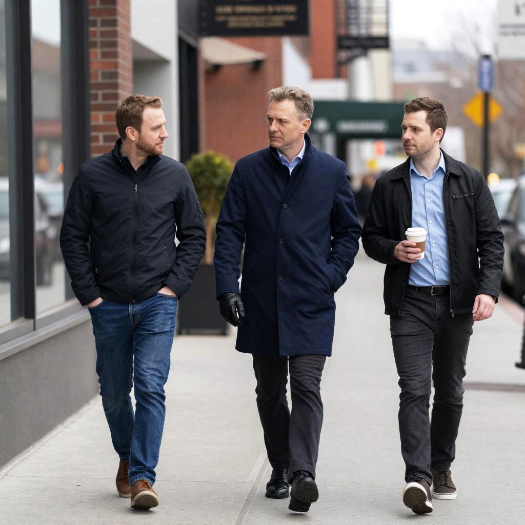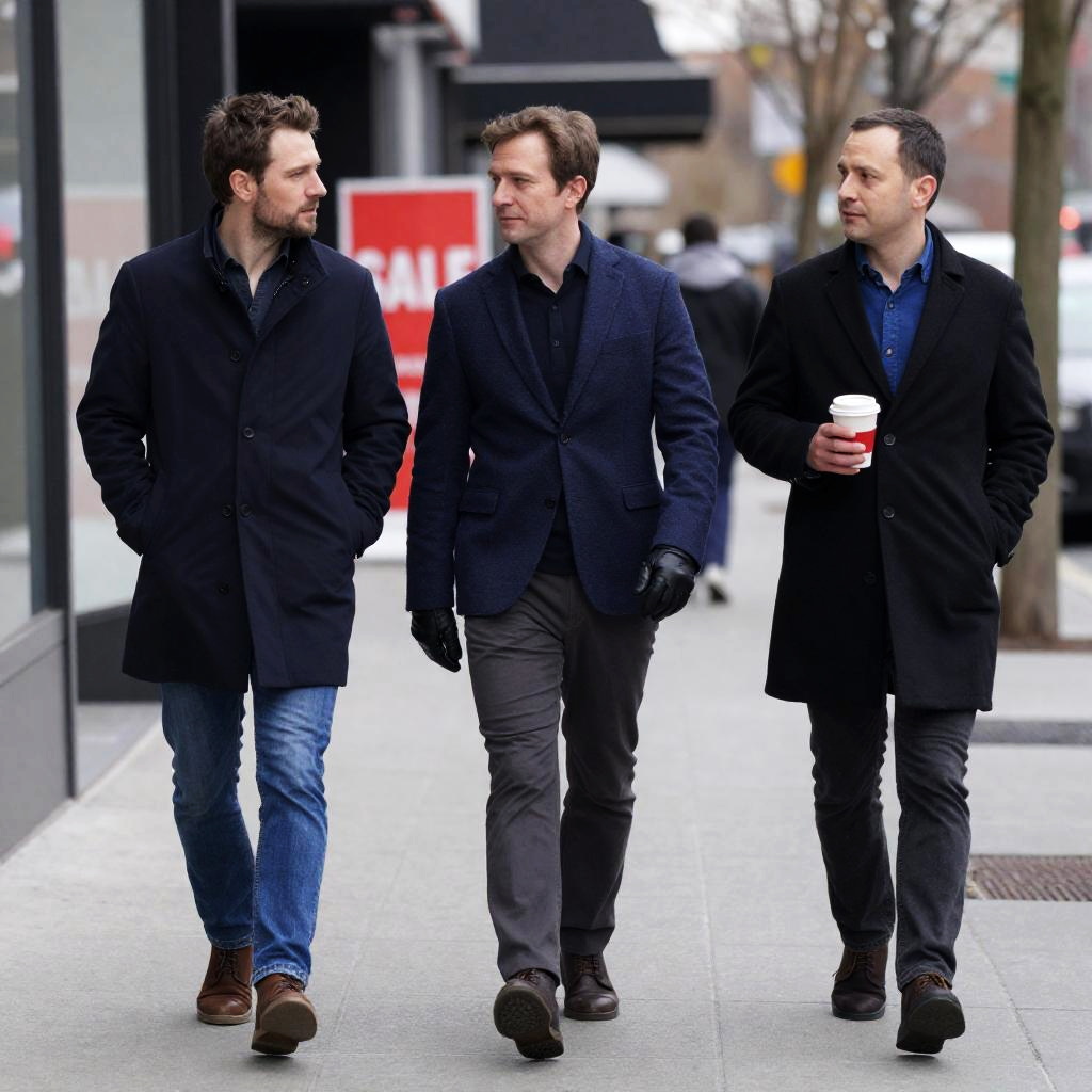 Photograph of three men standing on a city street. Left man, dark jacket, black gloves, open mouth, surprised expression. Center man, blue coat, black gloves, looking at right man. Right man, dark jacket, blue shirt, confident expression. All holding coffee cups. Yellow taxi in background, cobblestone street, urban buildings, blurry pedestrians.