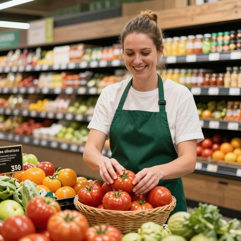Photograph of a smiling young woman with light skin and brown hair in a bun, wearing a white t-shirt and green apron, standing in a brightly lit grocery store. She is arranging red tomatoes in a wicker basket on a table filled with tomatoes, lettuce, and other fresh produce. Shelves in the background are stocked with various colorful jars and fruits. A black price tag reads "$3.99." The store has a modern, clean aesthetic with wooden shelves and fluorescent lighting.