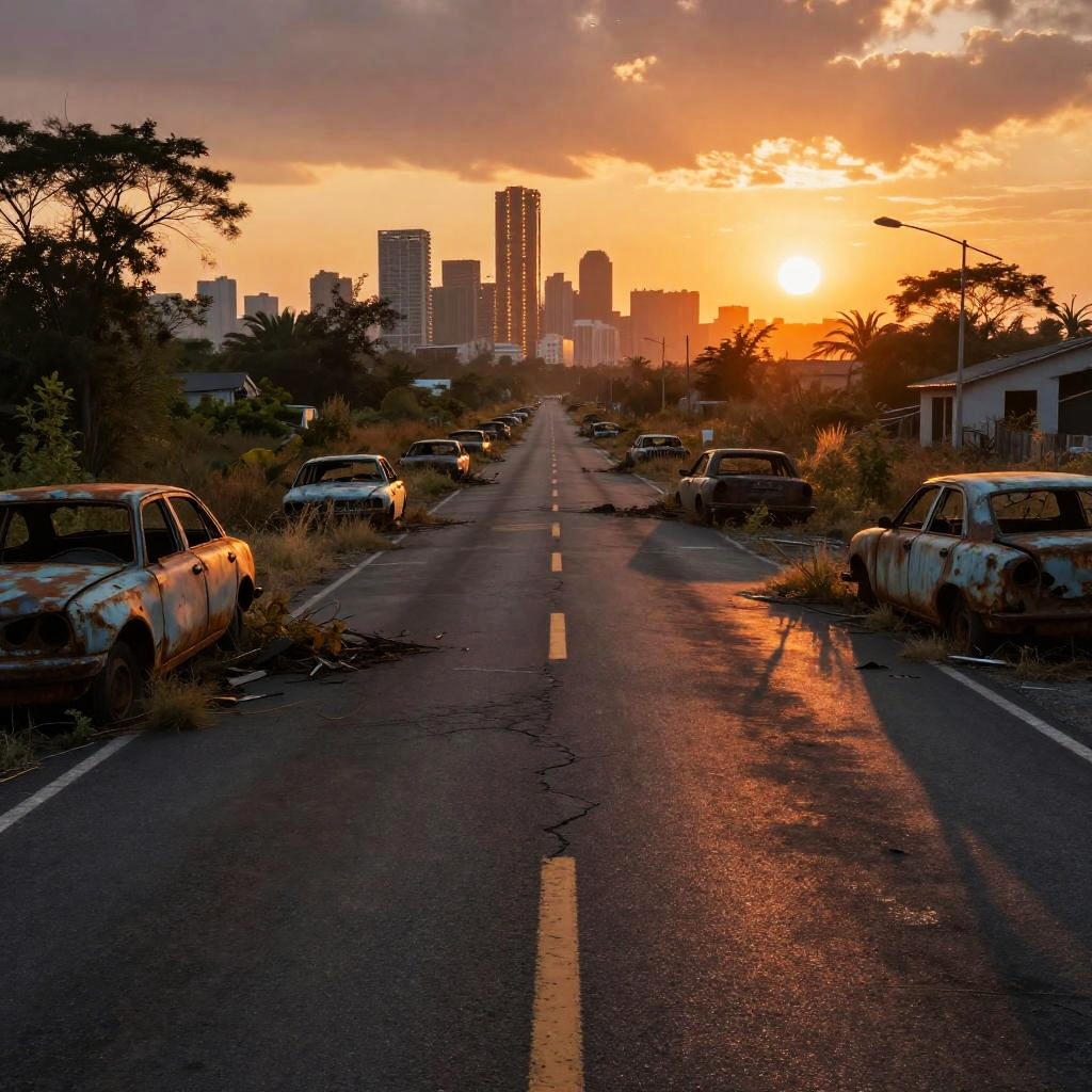 Asfгўltica post-apocalyptic highway, overgrown ruins of asphalt roads leading to a distant glowing metropolis, rusted cars and wild vegetation reclaiming the terrain, dramatic orange sunset casting long shadows on cracked surfaces