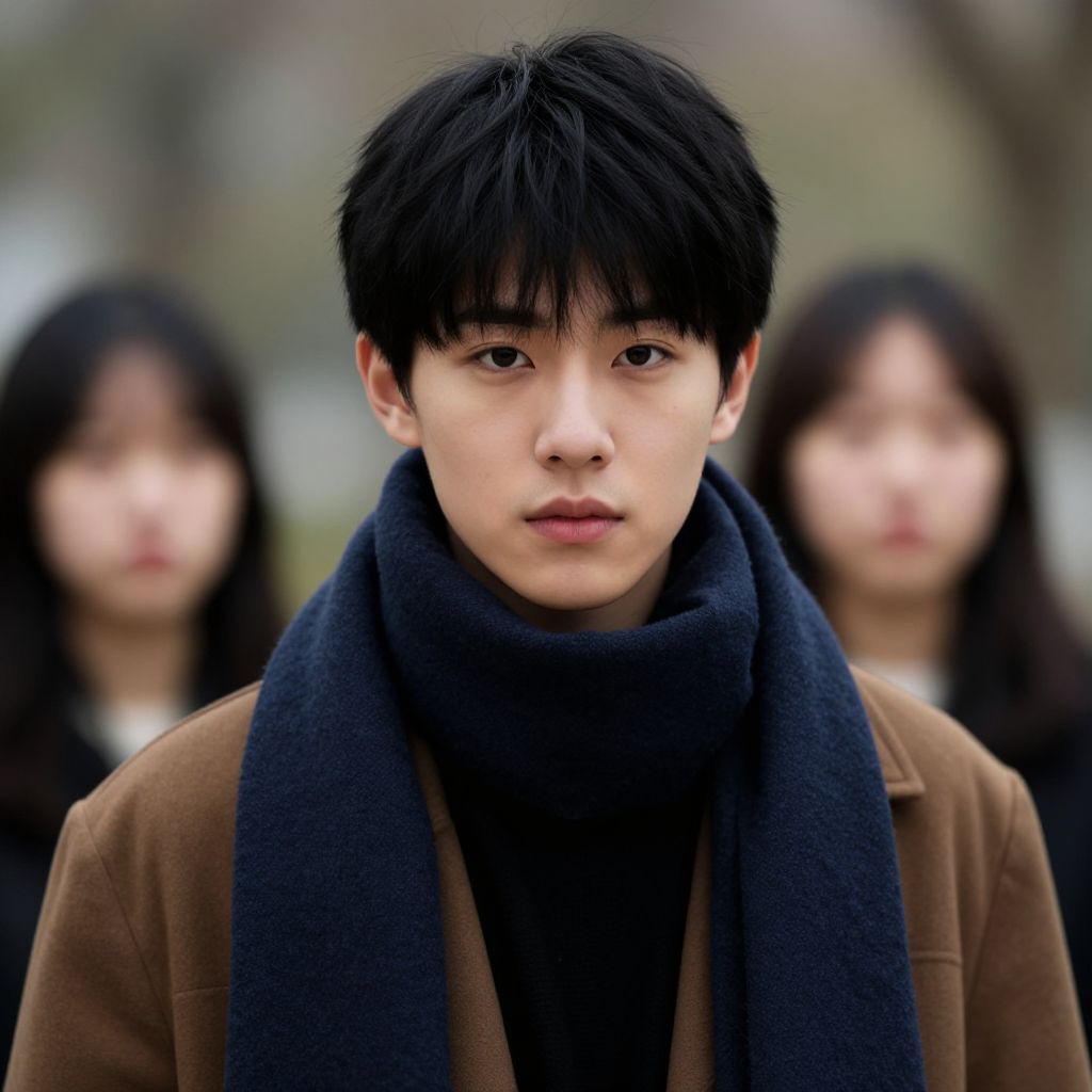 Photograph of a young East Asian man with short dark hair, wearing a black military-style jacket, standing in a blurred urban background with people.