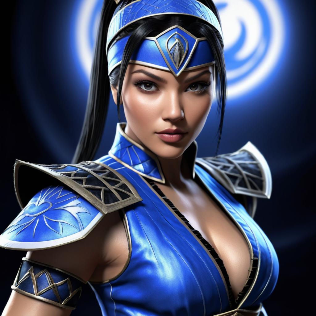 Kitana from Mortal Kombat photographed on an iPhone, rendered in a photorealistic style. The image captures the character with lifelike detail, highlighting intricate textures and features of the costume. The realistic lighting and high-resolution quality give the scene an authentic, cinematic feel, making the character appear as if they exist in the real world.
