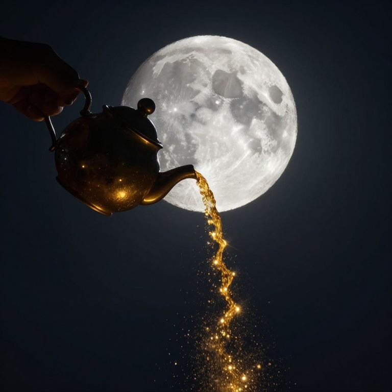 Photograph of a silhouetted person pouring tea from a traditional teapot against a bright, full moon in a dark night sky. The tea, glowing golden, contrasts sharply with the white, detailed moon. The person's silhouette is dark, with the teapot's spout angled upward, releasing a stream of tea. The moon's craters and textures are clearly visible, adding a surreal, dreamlike quality to the image. The dark sky enhances the luminosity of the moon and the tea. The overall composition creates a striking, celestial, and surreal visual effect.