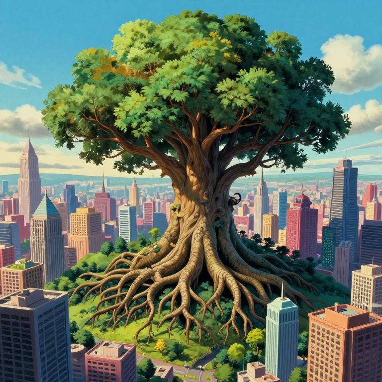 Digital illustration of a massive, tree with sprawling roots emerging from a cityscape, towering over skyscrapers under a bright blue sky.