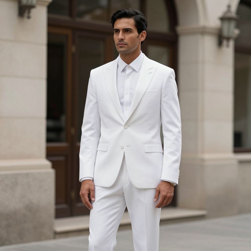 White Suit Shirt Costume, man in a white suit standing in front of a building