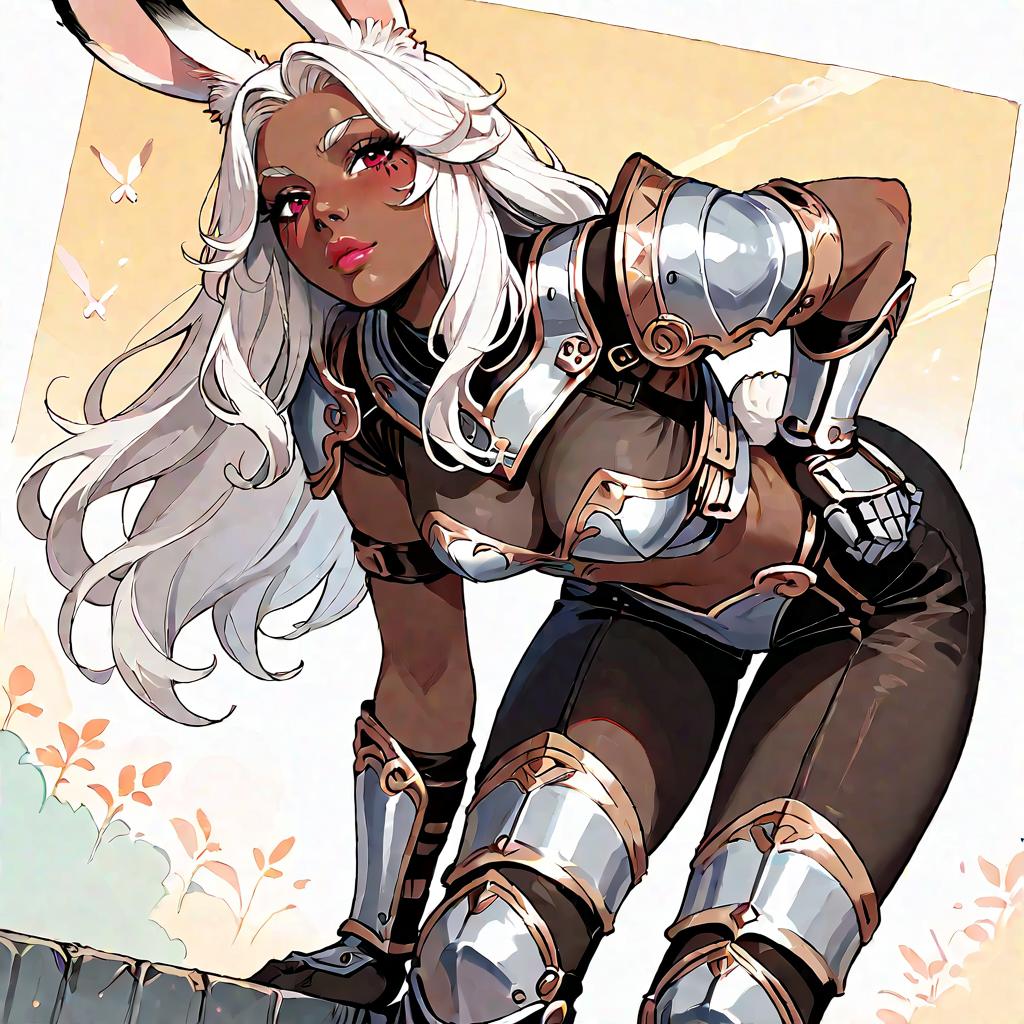 Score_9, score_8_up, score_7_up, source_anime 1girl, solo, viera, rabbit ears, dark skin, white hair, long hair, helmet, revealing clothes, armor, bracers, armored legwear, see-through, medium breasts, leaning forward, bending forward, looking at you, from below, parted lips