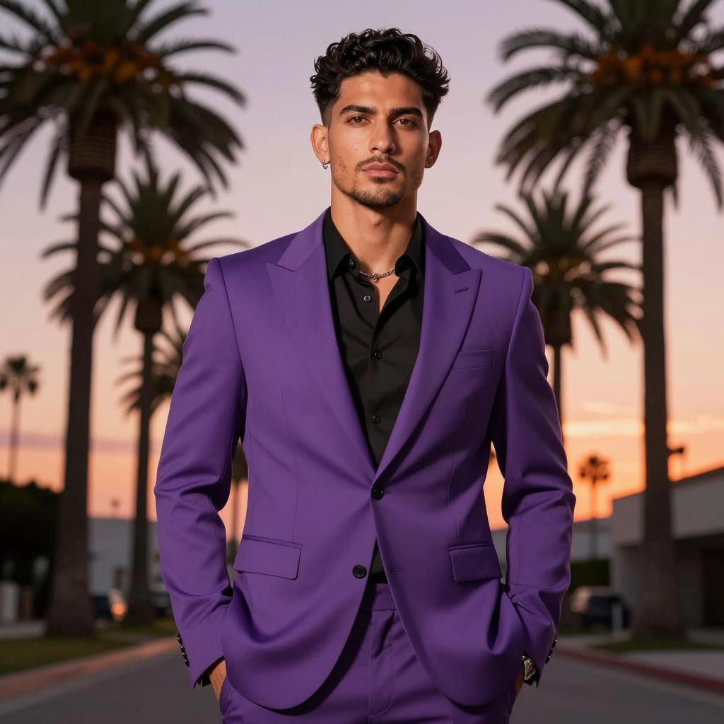 Portrait of a young man with medium skin tone and dark curly hair, wearing a vibrant purple suit and black shirt, standing outdoors during sunset. The background features tall palm trees and a clear sky with warm orange and pink hues, suggesting a stylish urban or coastal location. The man has a well-groomed beard and is accessorized with a chain necklace and an earring, adding to the sophisticated and fashionable look.