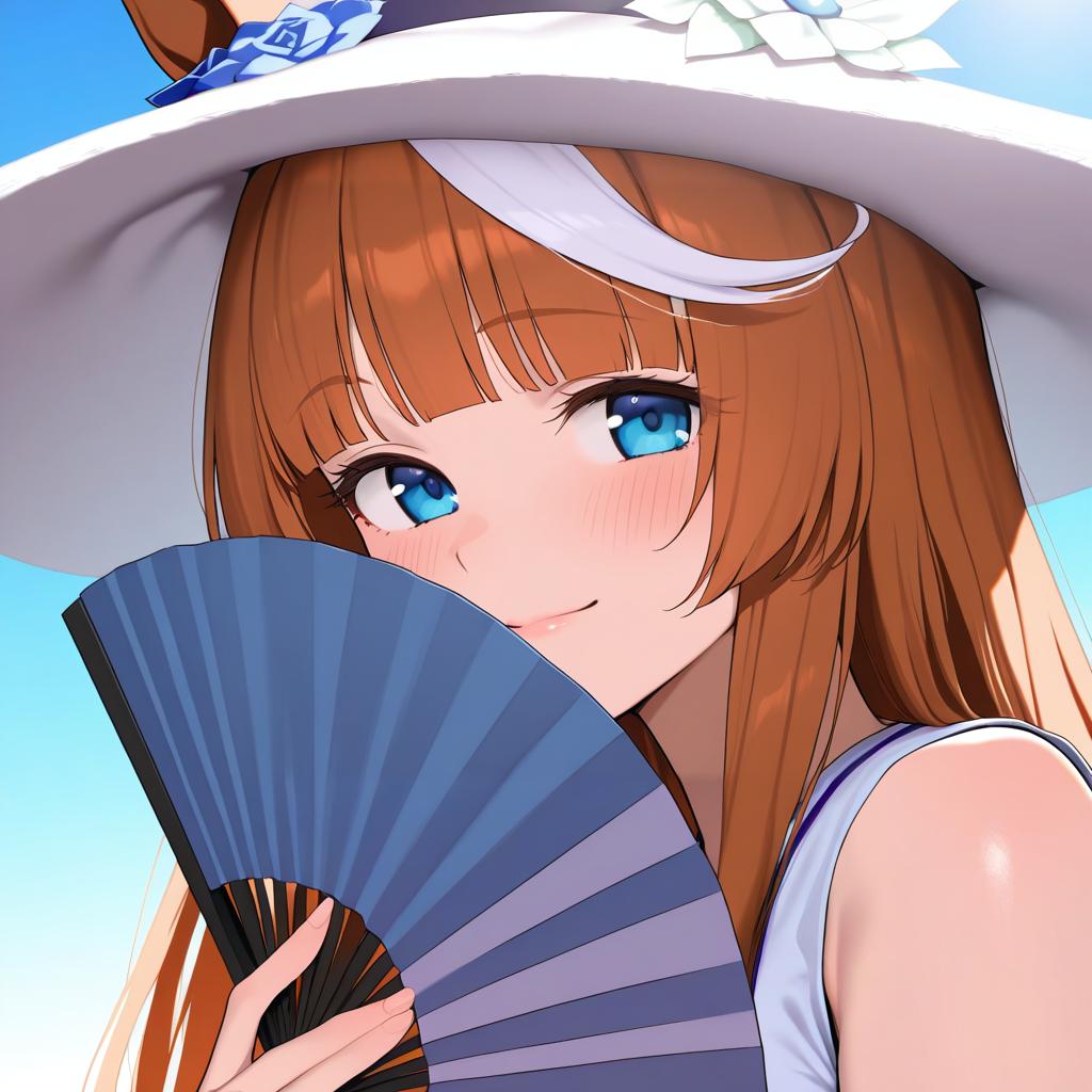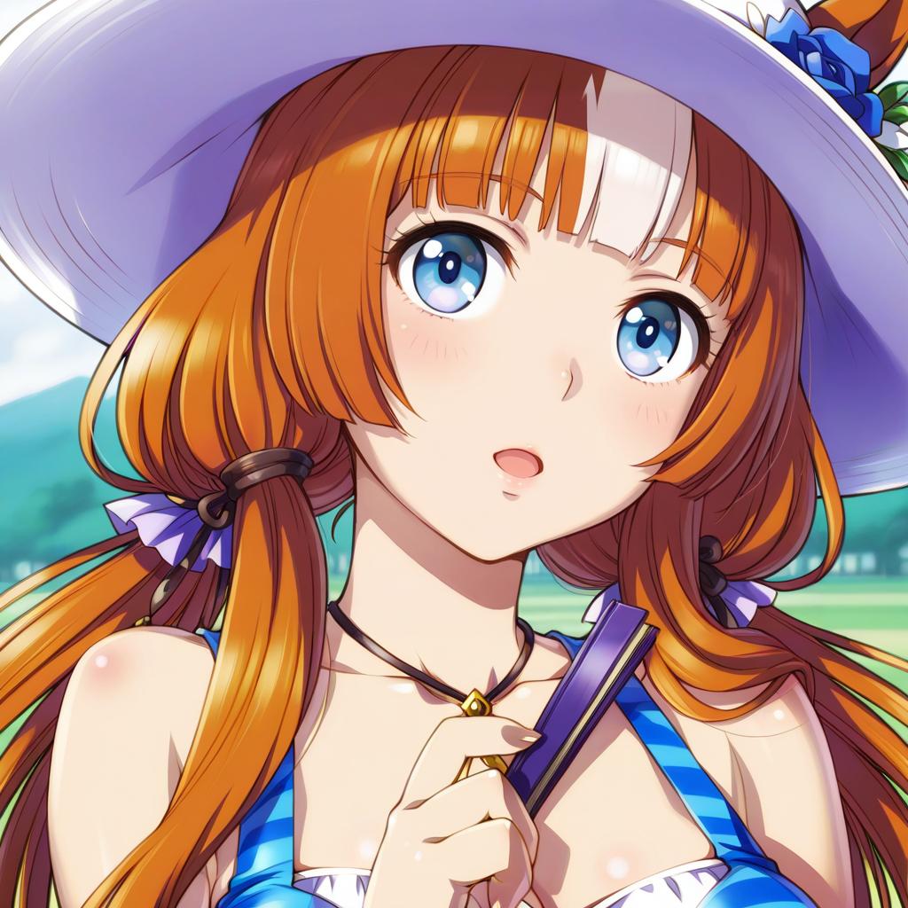 Akikawa yayoi (umamusume), umamusume, 1girl, horse girl, skin fang, fang, blue eyes, orange hair, long hair, white hair, streaked hair, two-tone hair, brown hair, blunt bangs, white headwear, hat flower, sun hat, folding fan, by artist kujou karasuma, anime