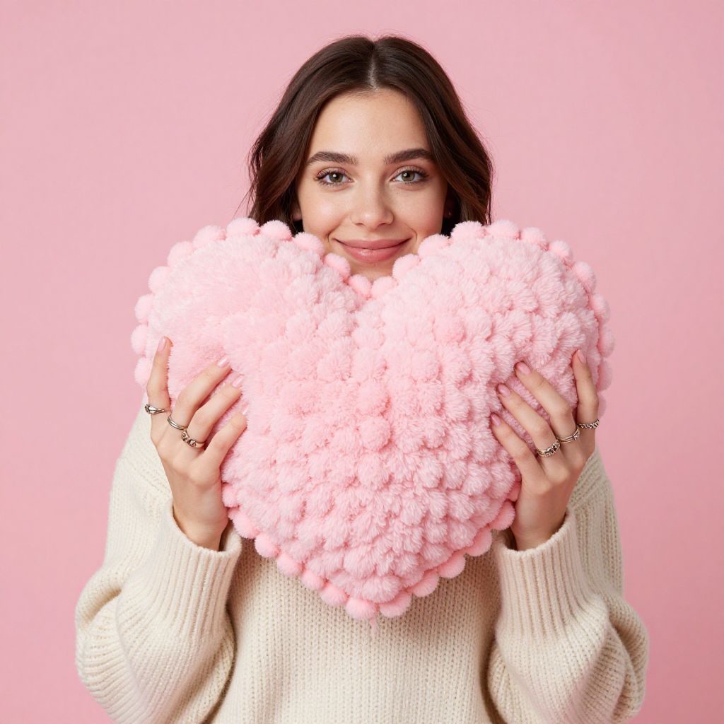Smiling woman holding a fluffy pink heart-shaped pom-pom cushion against a soft pink background, wearing a cozy cream sweater and adorned with multiple rings on her hands.