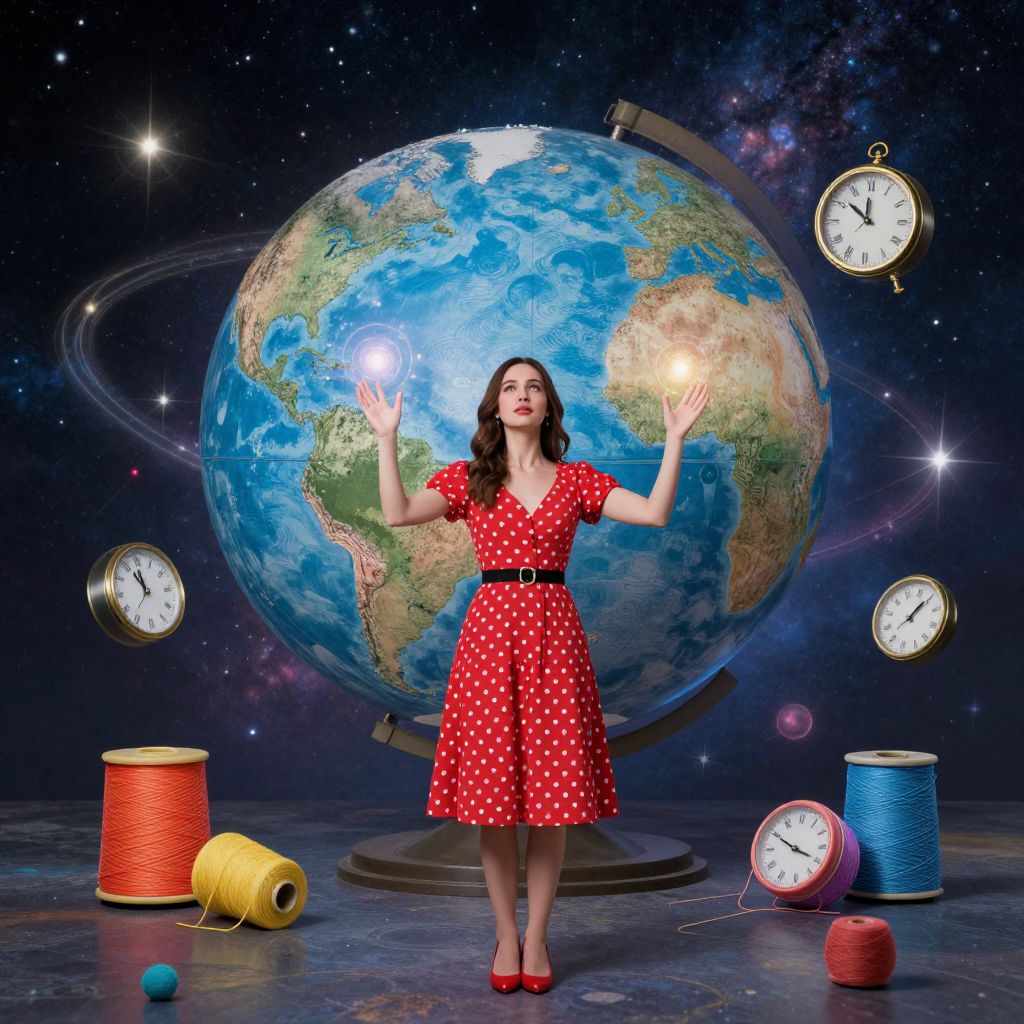 Photograph of a smiling woman with dark hair, wearing a red polka dot dress and red heels, standing in front of a large, illuminated globe against a starry, cosmic background. She holds up two glowing light bulbs in her hands. Surrounding her are six floating clocks and four spools of thread in red, yellow, blue, and purple. The globe features detailed continents and oceans, with a metallic stand. The scene combines vintage and space themes, with vibrant colors and a whimsical, surreal style.