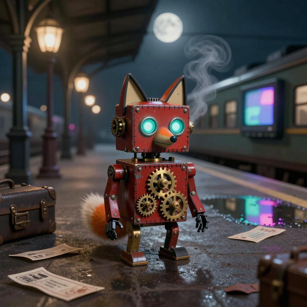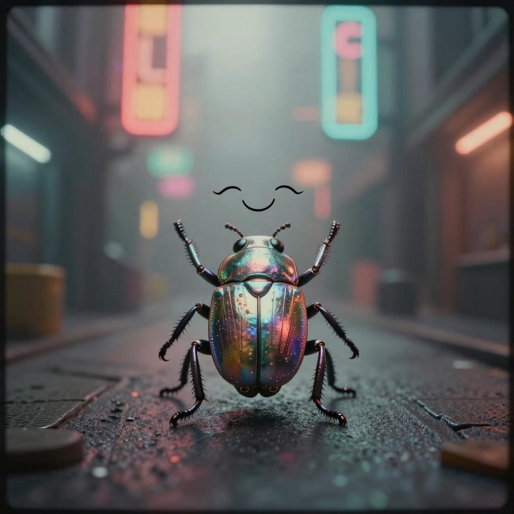 Night macro technology mysterious soft (Macro Focus) vignette f/8, macro lens, framing, Photograph of a tiny chrome insect with iridescent wings and delicate mechanical joints standing within a foggy cyberpunk alleyway illuminated by flickering neon signs. Candid cinema lighting from flickering screens, gentle rim light and soft shadows, RAW ultra-real cartoon texture with 16mm film grain, Portra 400 color grade, subtle halation, painterly cel outlines, nostalgic analog character, dynamic light/dark contrast that accentuates features, tidy composition, Style of Kilian Eng, Tim Burton, Claire Wendling, captured on an Olympus OM-D E-M1X, (happy facial expression, joy, smile:1.3), (closed eyes:1.1)