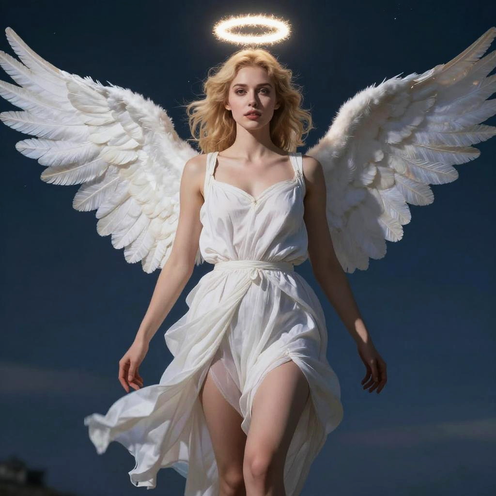 (masterpiece:1.2, best quality), photorealistic, (hyperrealistic:1.2), beautiful, a 23yo woman, angel, halo, angel wings, blonde hair, beautiful detailed eyes, angelic robes, (perfect anatomy), nice thighs, textured skin, flying, night sky, cool lighting, in heaven