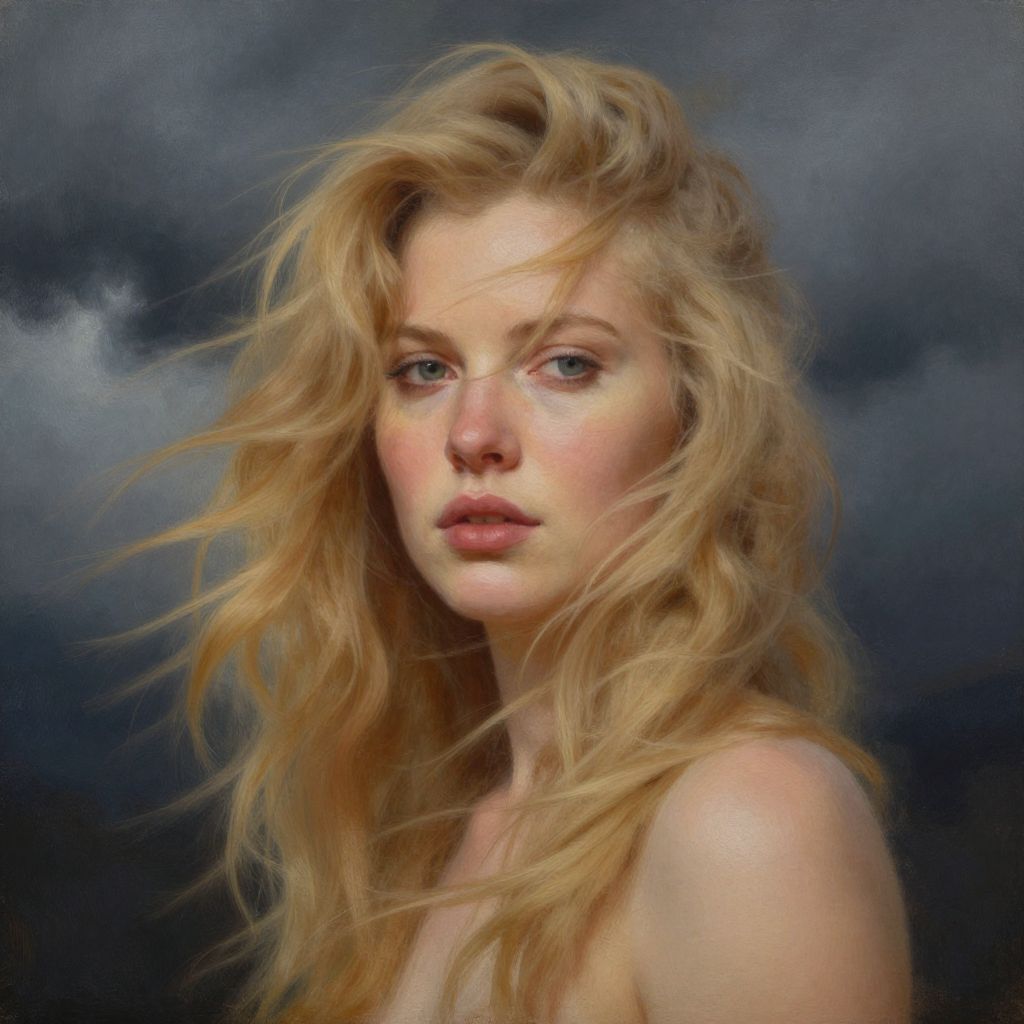 Portrait of a woman with thick blond hair, textured and voluminous, flowing freely in the breeze, set against a dramatic stormy background, contrast between light and shadow, hyper-realistic details, painted in soft oil colors with fine brush strokes.