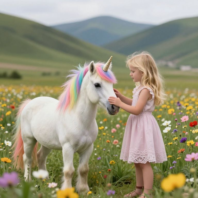 Photograph of a blonde girl in a pink dress gently petting a white unicorn with a rainbow mane in a colorful meadow.
